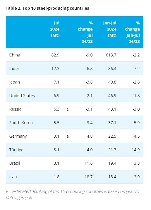 世界鋼鐵協(xié)會數(shù)據(jù)顯示,2024年7月全球71個納入世界鋼鐵協(xié)會統(tǒng)計(jì)國家的粗鋼產(chǎn)量為1.528億噸,同比下降4.7%。其中,中國粗鋼產(chǎn)量同比下降9.0%,降至8290萬噸。印度7月粗鋼產(chǎn)量為1230萬噸,同比增加6.8%;今年1-7月粗鋼產(chǎn)量為0.864億噸,同比增加7.2%。