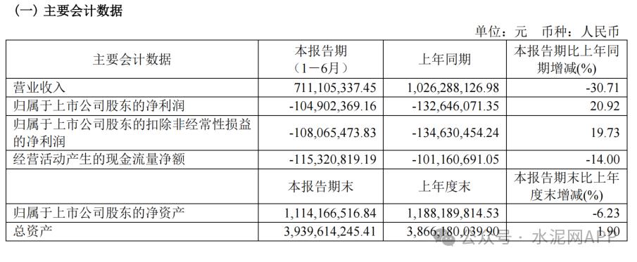 福建水泥8月23日晚間披露半年報,2024年上半年實現(xiàn)營業(yè)收入7.11億元,同比下降30.71%;凈利潤虧損1.05億元,同比減虧。