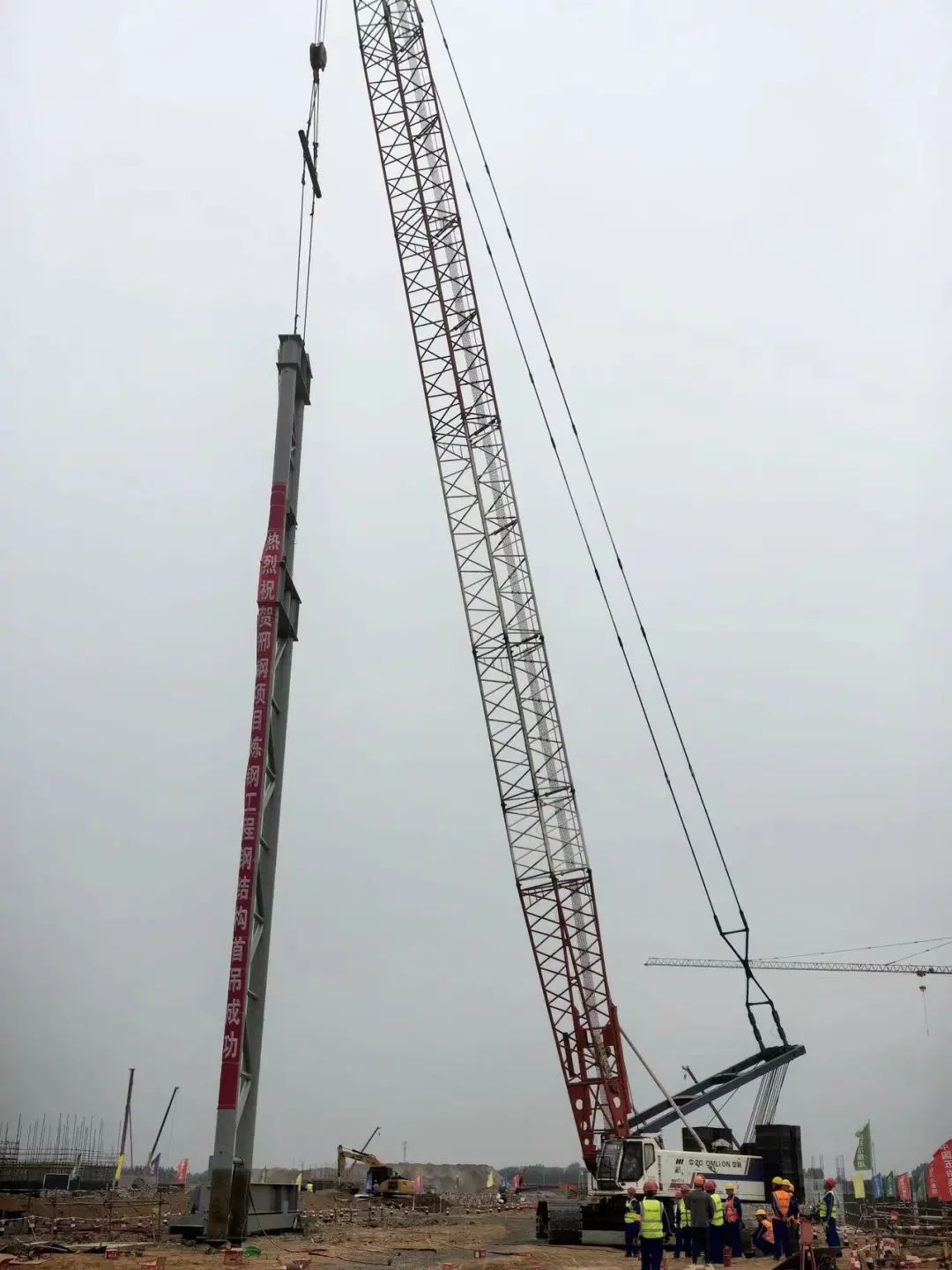 在激情似火、掌聲雷鳴的項(xiàng)目施工現(xiàn)場,隨著公司董事長張育明“首吊開始”的工作指令,在公司副總經(jīng)理馬保良、韓清連及現(xiàn)場8支施工隊(duì)伍近450名員工的共同見證下,高聳矗立的塔吊緩緩將30.6米的鋼結(jié)構(gòu)成功吊起,并順利移入基礎(chǔ)杯口內(nèi)。