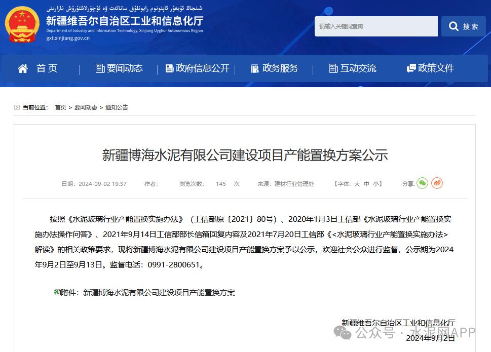 9月2日,新疆工信廳發(fā)布“新疆博海水泥有限公司建設(shè)項目產(chǎn)能置換方案公示”。