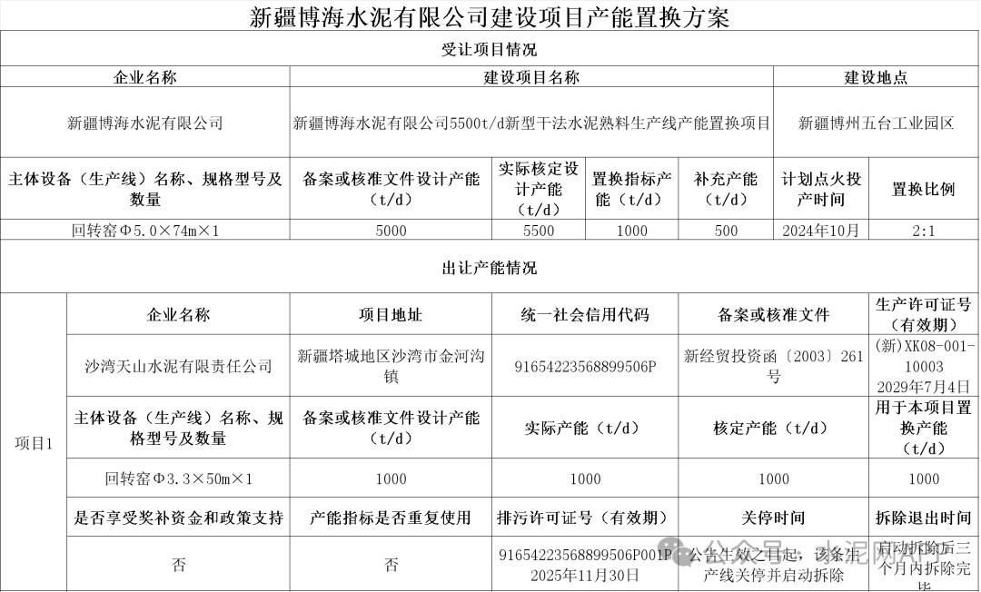 置換方案表顯示,沙灣天山水泥有限責(zé)任公司出讓1000t/d熟料產(chǎn)能,用于新疆博海水泥有限公司5500t/d水泥熟料生產(chǎn)線置換項目,補充500t/d產(chǎn)能。