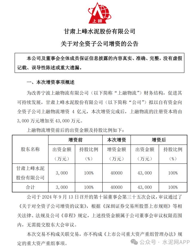 上峰水泥9月13日晚間公告,公司擬以自有資金向全資子公司上融物流增資4億元,本次增資完成后,上融物流的注冊(cè)資本將由3000萬元增加至4.3億元。本次增資為進(jìn)一步改善和優(yōu)化寧波上融物流有限公司財(cái)務(wù)結(jié)構(gòu),促進(jìn)可持續(xù)發(fā)展,本次增資的資金來源為公司自有資金,不會(huì)對(duì)公司財(cái)務(wù)和經(jīng)營(yíng)狀況產(chǎn)生不利影響,不存在損害公司及股東利益的情形。