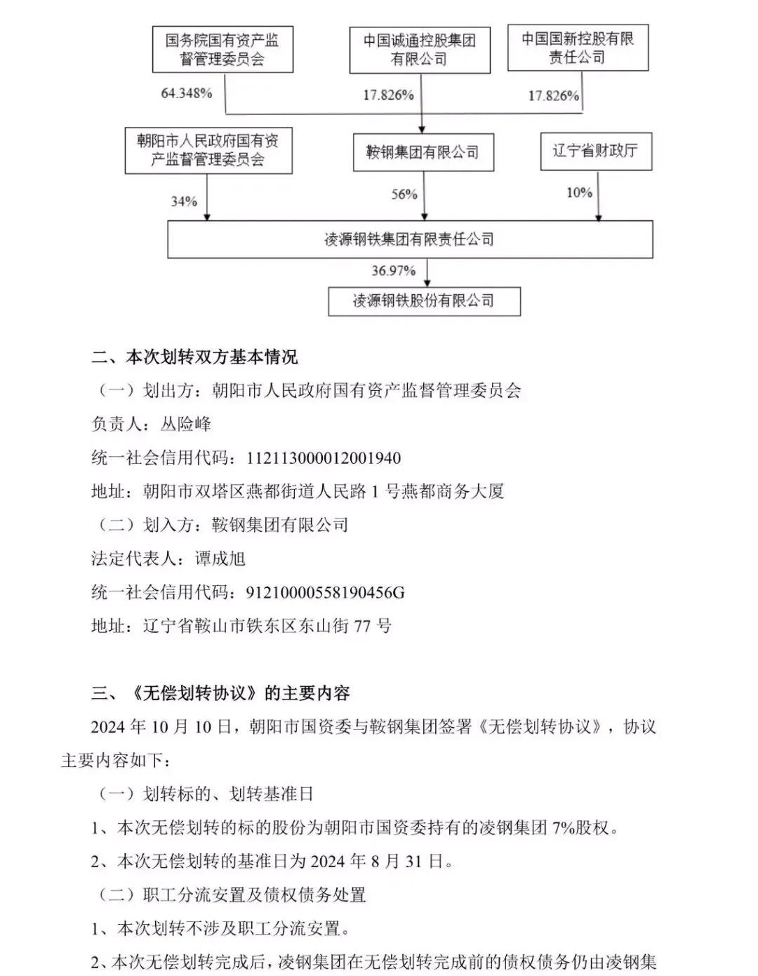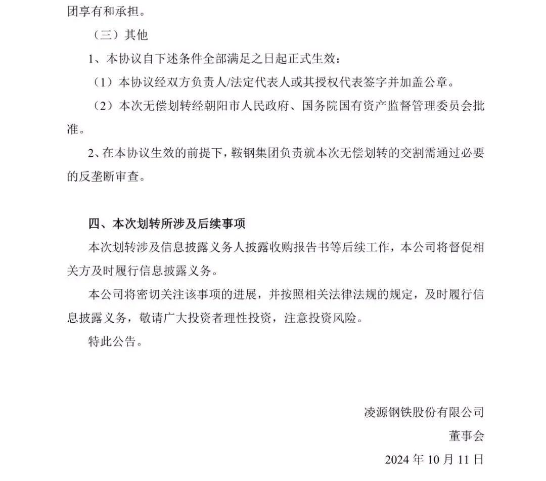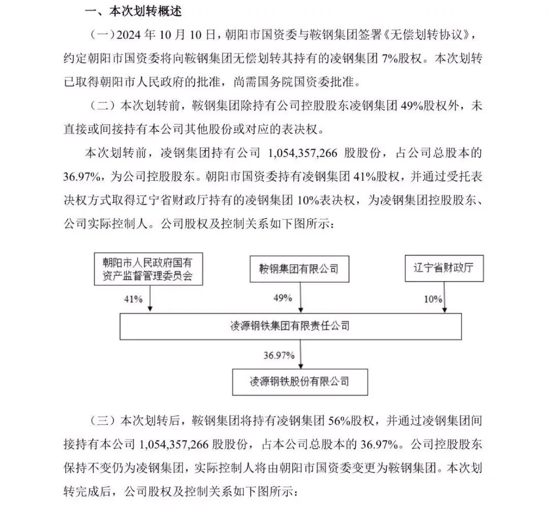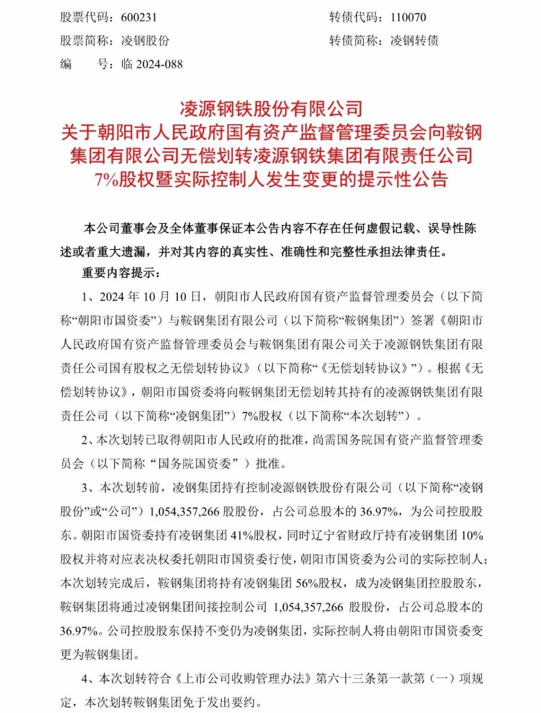 凌鋼股份10月10日晚間發(fā)布公告稱(chēng),朝陽(yáng)市國(guó)資委與鞍鋼集團(tuán)簽署《無(wú)償劃轉(zhuǎn)協(xié)議》,約定朝陽(yáng)市國(guó)資委將向鞍鋼集團(tuán)無(wú)償劃轉(zhuǎn)其持有的凌鋼集團(tuán) 7%股權(quán)。本次劃轉(zhuǎn)已取得朝陽(yáng)市人民政府的批準(zhǔn),尚需國(guó)務(wù)院國(guó)資委批準(zhǔn)。