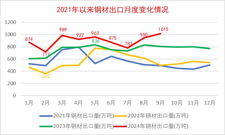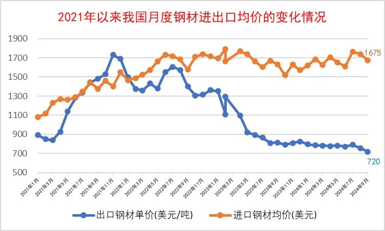 2024年9月,我國出口鋼材1015.4萬噸,環(huán)比增加65.8萬噸、增幅6.9%,同比增加209.0萬噸、增幅25.9%;平均出口單價719.6美元/噸,環(huán)比減少35.9美元/噸、降幅4.8%,同比減少94.6美元/噸、降幅11.6%。1-9月,我國累計出口鋼材8071.2萬噸,同比增加1389.4萬噸、增幅20.8%;累計平均出口單價769.9美元/噸,同比減少215.8美元/噸、降幅21.9%;累計出口鋼坯341.2萬噸,同比增加93.9萬噸、增幅38.0%;折合粗鋼凈出口8015萬噸,同比增加1645萬噸、增幅25.8%。2024年9月,我國進口鋼材55.4萬噸,環(huán)比增加4.5萬噸、增幅8.8%,同比減少8.7萬噸、降幅13.6%;平均進口單價1675.5美元/噸,環(huán)比減少65.5美元/噸、降幅3.8%,同比增加43.5美元/噸、增幅2.7%。1-9月,我國累計進口鋼材518.5萬噸,同比減少51.3萬噸、降幅9.0%;累計平均進口單價1673.4美元/噸,同比減少15.2美元/噸、降幅0.9%;累計進口鋼坯160.3萬噸,同比減少37.6萬噸、降幅19.0%。