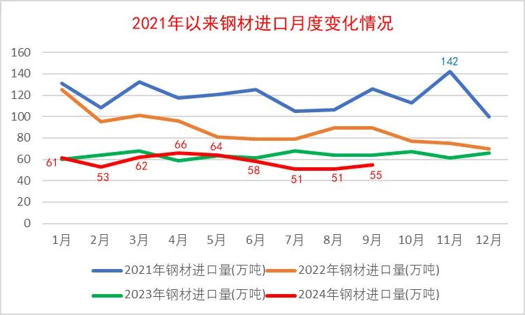 2024年9月,鋼材進口量環(huán)比小幅增長,自主要國家進口規(guī)模也保持總體平穩(wěn)。具體情況如下: