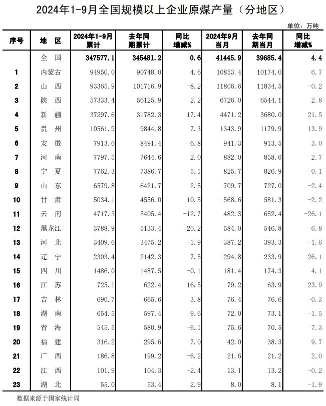 2024年1-9月份全國規(guī)模以上分省區(qū)原煤產(chǎn)量數(shù)據(jù)發(fā)布