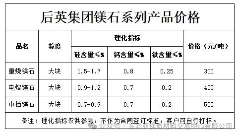今日,后英集團也公布了最新的菱鎂礦石理化指標及產(chǎn)品報價,根據(jù)后英集團發(fā)布的信息,本次更新的三種礦石較近期的市場價同樣有一定上浮。