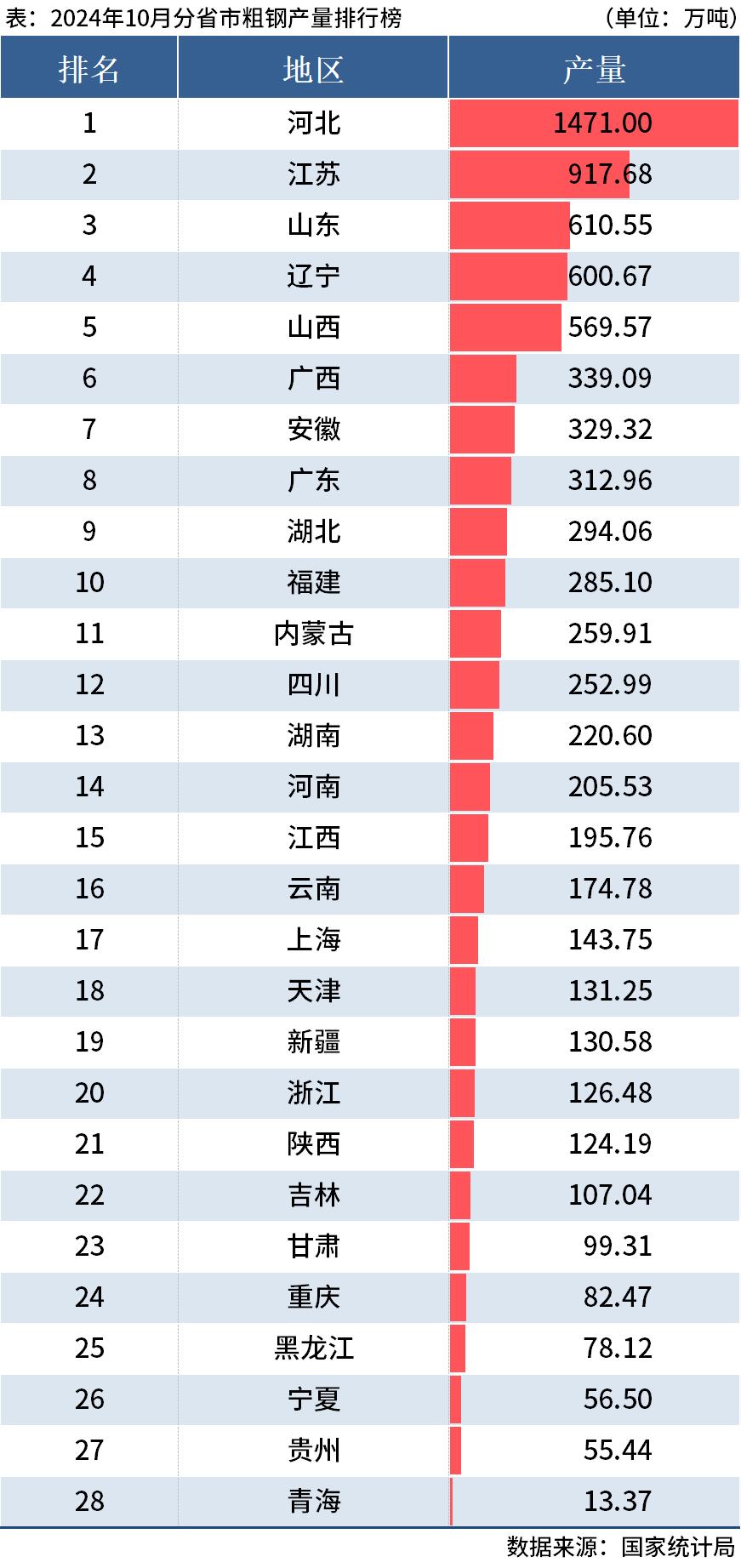 國家統(tǒng)計局數(shù)據(jù)顯示,2024年10月中國粗鋼產(chǎn)量8188.1萬噸,同比增長2.9%;1-10月中國粗鋼產(chǎn)量85073.1萬噸,同比下降3.0%。從分省市數(shù)據(jù)來看,2024年1-10月河北以產(chǎn)量17335.93萬噸位列第一;江蘇產(chǎn)量10021.21萬噸排在第二;山東產(chǎn)量6195.09萬噸排在第三。