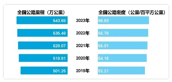 年末全國(guó)公路里程543.68萬(wàn)公里,比上年末增加8.20萬(wàn)公里。公路密度56.63公里/百平方公里,增加0.85公里/百平方公里。