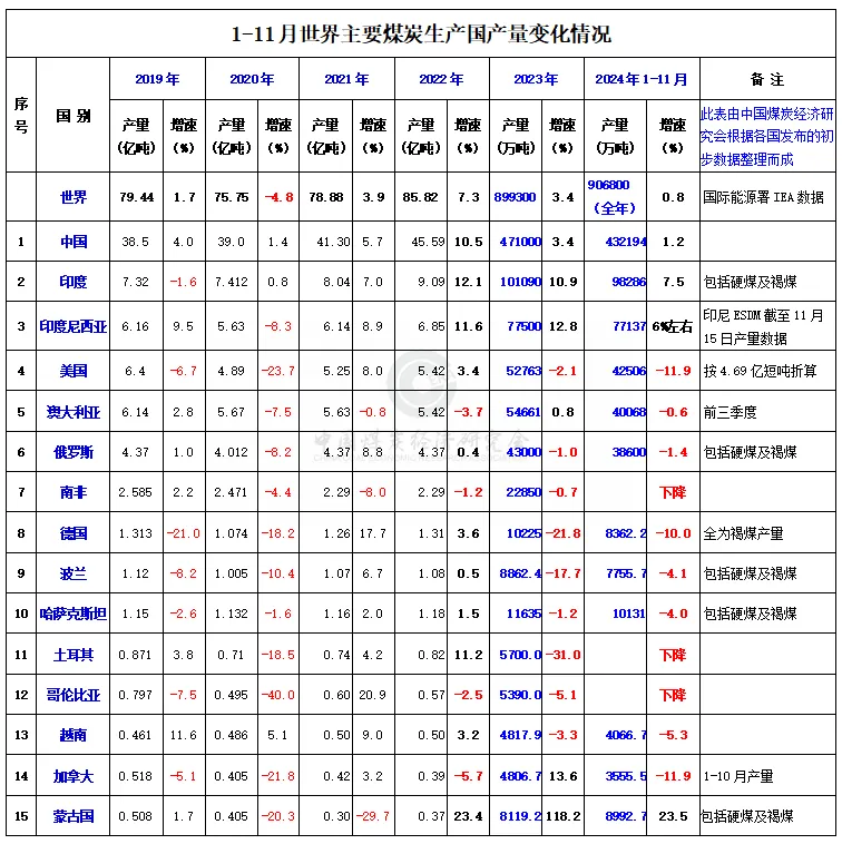 2024年1-11月世界主要煤炭生產(chǎn)國產(chǎn)量變化情況