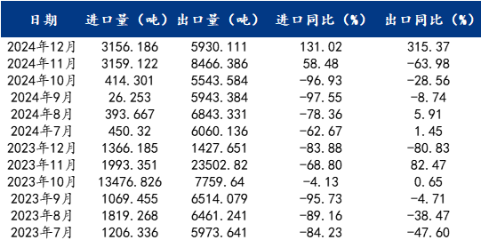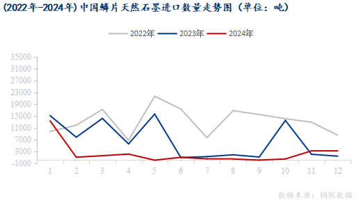 四、鱗片石墨市場(chǎng)分析2024年12月鱗片石墨進(jìn)口出口水平年同比均有明顯上漲,但月環(huán)比均有小幅下調(diào)。結(jié)合國(guó)內(nèi)市場(chǎng)因素來(lái)看,冬季黑龍江石墨生產(chǎn)企業(yè)多處停產(chǎn)狀態(tài),產(chǎn)量環(huán)比下降明顯。而國(guó)內(nèi)需求端表現(xiàn)不佳,市場(chǎng)買氣不足,訂單下達(dá)不及預(yù)期,整體市場(chǎng)供需雙弱,價(jià)格維持低位運(yùn)行。從國(guó)外市場(chǎng)因素來(lái)看,外貿(mào)訂單已至年內(nèi)尾期,需求淡季,進(jìn)出口訂單下達(dá)數(shù)量有限。
