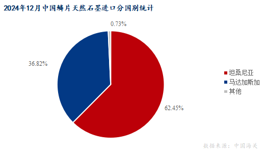 三、鱗片石墨主要進(jìn)出口國(guó)家2024年12月天然鱗片石墨進(jìn)口的3156.18噸,從坦桑尼亞進(jìn)口量最大,占比為62.45%,從馬達(dá)加斯加進(jìn)口量占比為36.82%,其他貿(mào)易伙伴進(jìn)口總量為23.14噸,占比不足1%。