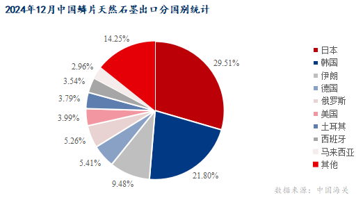 2024年12月天然鱗片石墨出口的5930.11噸,其中日本出口量最大為1750.256噸,占總比重的29.51%,其次是韓國(guó)出口量為1292.51噸,占總比重的21.8%,其他貿(mào)易伙伴出口量占比為14.25%。