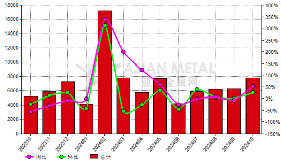2024年10月份馬達(dá)加斯加石墨粉出口量7,825.02公噸,去年同期為5,179.63公噸,上月為6,299.38公噸,同比增長51.07%,環(huán)比增長24.22%。
