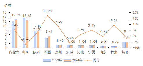 自煤炭行業(yè)經(jīng)過供給側(cè)改革、兼并重組等舉措后,晉陜蒙新四大主產(chǎn)區(qū)煤炭產(chǎn)業(yè)集中度進(jìn)一步提升,成為全國煤炭增產(chǎn)的核心力量,其中新疆增長尤為突出。2024年全國23個(gè)煤炭生產(chǎn)省區(qū)中,有13個(gè)省區(qū)增產(chǎn),10個(gè)省區(qū)減產(chǎn);其中產(chǎn)量破億噸的省區(qū)8個(gè),產(chǎn)量由高到低依次為內(nèi)蒙古、山西、陜西、新疆、貴州、安徽、河南、寧夏;產(chǎn)量在5000萬噸至1億噸的有4個(gè),產(chǎn)量由高到低依次為山東、甘肅、云南、黑龍江。