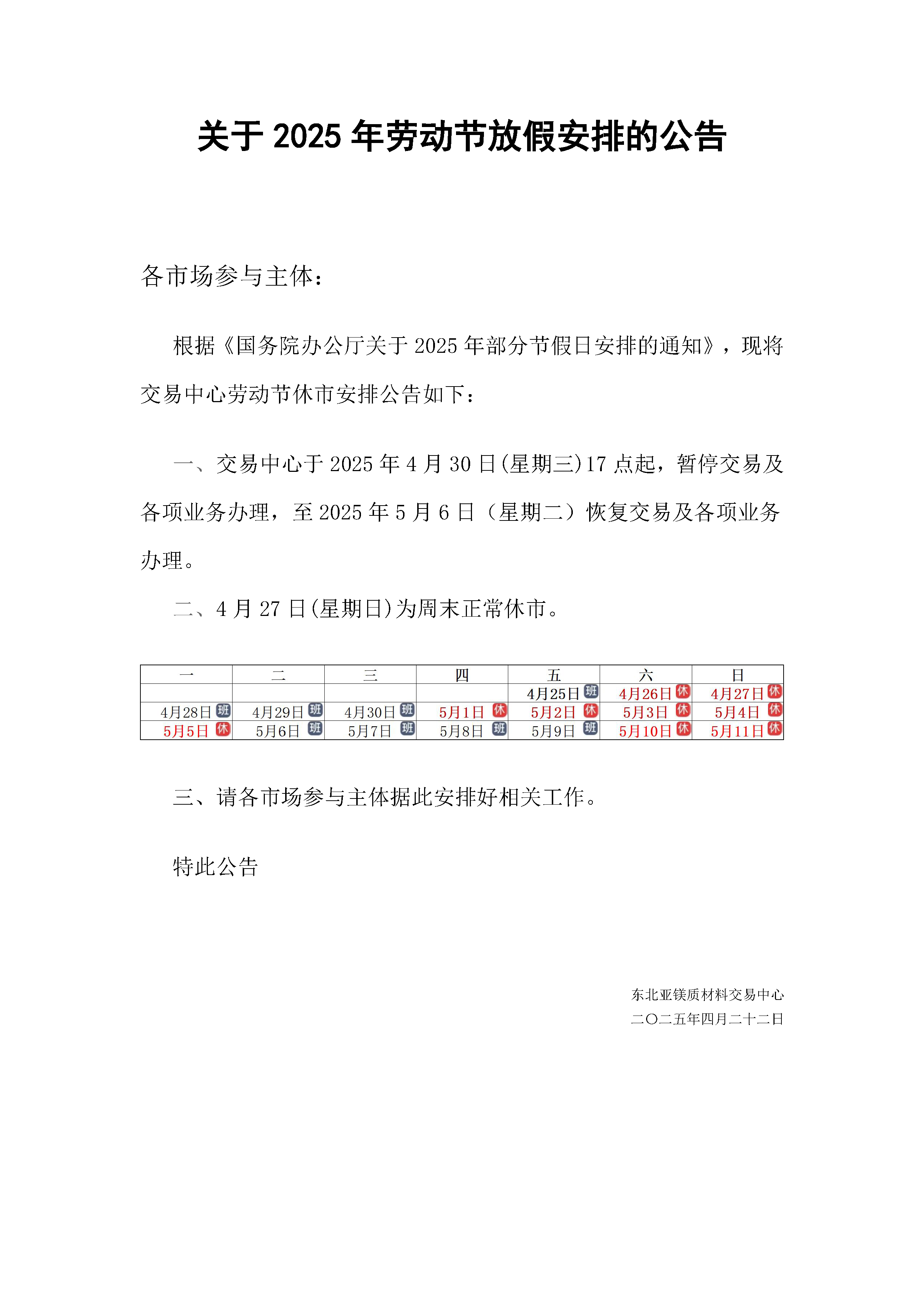 關(guān)于2025年勞動(dòng)節(jié)放假安排的通知