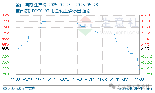 近期國(guó)內(nèi)螢石價(jià)格走勢(shì)下滑,截止上周末國(guó)內(nèi)螢石均價(jià)為3525元/噸,較上周初價(jià)格3606.25元/噸下滑2.25%,同比下滑7.39%。