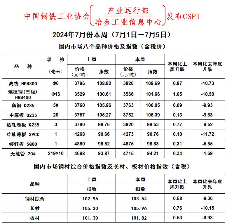 2024年7月份本周(7月1日-7月5日)國內(nèi)市場八個(gè)品種價(jià)格及指數(shù)