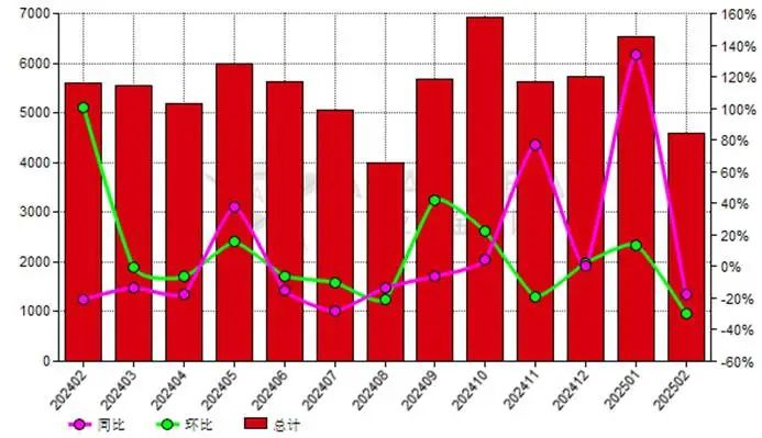 2025年2月份美國石墨粉進(jìn)口量4,589.76公噸,去年同期為5,593.07公噸,上月為6,525.39公噸,同比下滑17.94%,環(huán)比下滑29.66%。