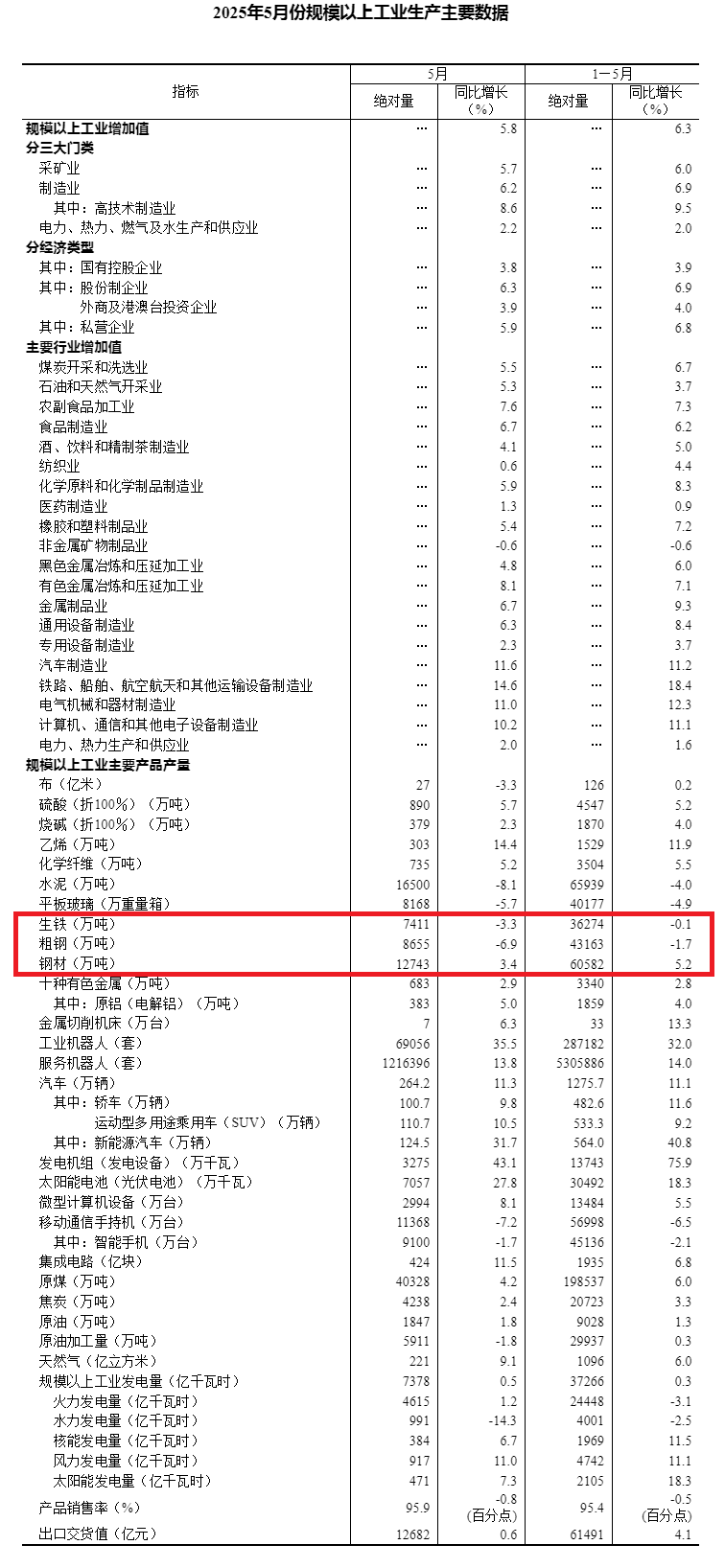國家統(tǒng)計局公布的數(shù)據(jù)顯示,2025年5月份,中國粗鋼產(chǎn)量8655萬噸,同比下降6.9%;生鐵產(chǎn)量7411萬噸,同比下降3.3%;鋼材產(chǎn)量12743萬噸,同比增長3.4%。1-5月份,中國粗鋼產(chǎn)量43163萬噸,同比下降1.7%;生鐵產(chǎn)量36274萬噸,同比下降0.1%;鋼材產(chǎn)量60582萬噸,同比增長5.2%。分三大門類看,5月份,采礦業(yè)增加值同比增長5.7%,制造業(yè)增長6.2%,電力、熱力、燃氣及水生產(chǎn)和供應(yīng)業(yè)增長2.2%。分行業(yè)看,5月份,41個大類行業(yè)中有35個行業(yè)增加值保持同比增長。其中,煤炭開采和洗選業(yè)增長5.5%,石油和天然氣開采業(yè)增長5.3%,農(nóng)副食品加工業(yè)增長7.6%,酒、飲料和精制茶制造業(yè)增長4.1%,紡織業(yè)增長0.6%,化學(xué)原料和化學(xué)制品制造業(yè)增長5.9%,非金屬礦物制品業(yè)下降0.6%,黑色金屬冶煉和壓延加工業(yè)增長4.8%,有色金屬冶煉和壓延加工業(yè)增長8.1%,通用設(shè)備制造業(yè)增長6.3%,專用設(shè)備制造業(yè)增長2.3%,汽車制造業(yè)增長11.6%,鐵路、船舶、航空航天和其他運輸設(shè)備制造業(yè)增長14.6%,電氣機械和器材制造業(yè)增長11.0%,計算機、通信和其他電子設(shè)備制造業(yè)增長10.2%,電力、熱力生產(chǎn)和供應(yīng)業(yè)增長2.0%。