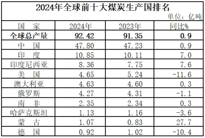 根據(jù)《年鑒》,2024年,中國煤炭產(chǎn)量47.8億噸,同比增長0.9%,占全球總產(chǎn)量的51.7%。煤炭產(chǎn)量億噸以上的國家為9個,分別為,中國、印度、印度尼西亞、美國、澳大利亞、俄羅斯、南非、哈薩克斯坦、蒙古國。其中,蒙古國產(chǎn)量首次過億噸,且增幅最大,達27.7%,中國、印度、印度尼西亞、澳大利亞和南非煤炭產(chǎn)量較上年有所增加。
