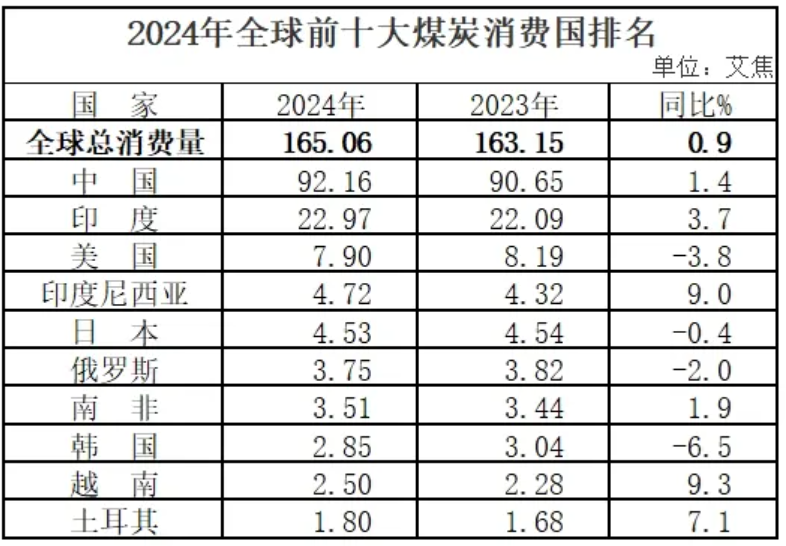 2024年,中國煤炭消費量為92.16艾焦(EJ),同比增長1.4%,占全球總消費量的55.8%。消費量排名前十的國家分別為:中國、印度、美國、印度尼西亞、日本、俄羅斯、南非、韓國、越南和土耳其。其中,中國、印度、印度尼西亞、南非、越南和土耳其煤炭消費量較上年有所增加。