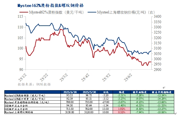截至目前,Mysteel62%澳粉遠期價格指數(shù)93.55美元/噸,環(huán)比下跌3.2美元/噸,跌幅3.31%。上海螺紋鋼價格3130元/噸,環(huán)比 上漲10元/噸,漲幅0.32%。