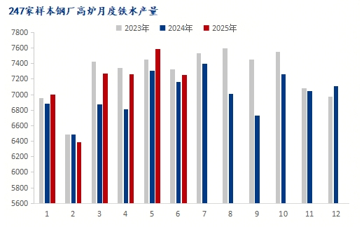 需求端方面,6月鋼鐵出口在90天關稅暫停期內(nèi)繼續(xù)維持較高水平,下游需求走弱程度有限,產(chǎn)業(yè)及鐵礦石自身基本面矛盾累積速度偏慢,鋼廠減產(chǎn)壓力較小,在淡季以及行政減產(chǎn)到來前抓緊生產(chǎn)兌現(xiàn)利潤動力較足,6月日均鐵水產(chǎn)量整體在241-242萬噸之間窄幅波動,多數(shù)為年中短期高爐檢修,未出現(xiàn)規(guī)模性持續(xù)減產(chǎn)。